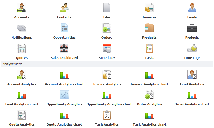 Create custom entities with forms, views and analytics for all of your business functions: financials, sales, production, operations, etc.