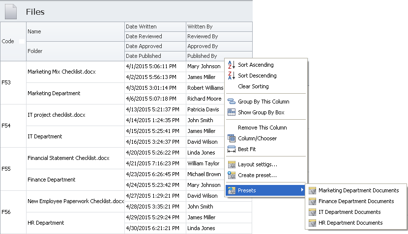 Modify default layout of any view according to your requirements, save and load shared and personal layout presets.