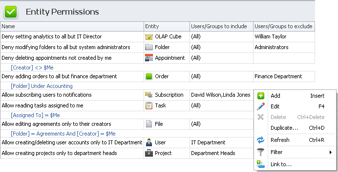 Set flexible permission rules for users and groups to restrict their rights to 'read' or 'write' certain data under certain conditions.