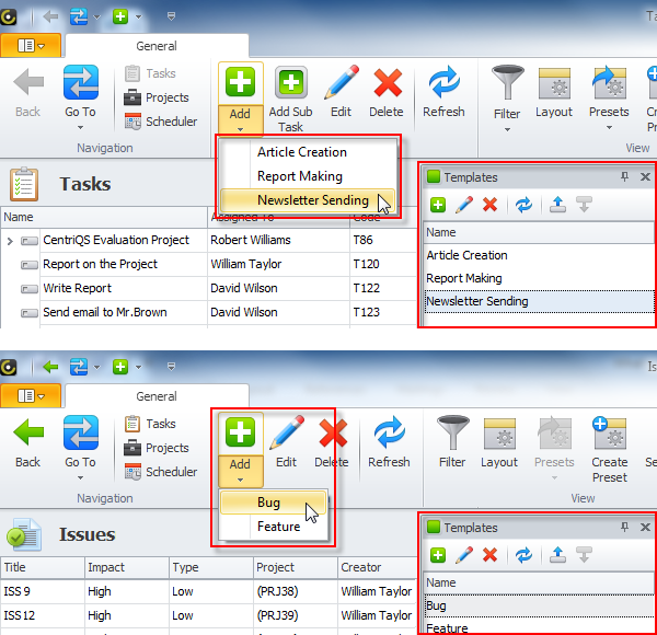 Create various templates for any business objects to quickly and easily add new data with pre-saved settings and values.