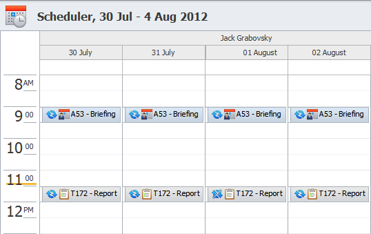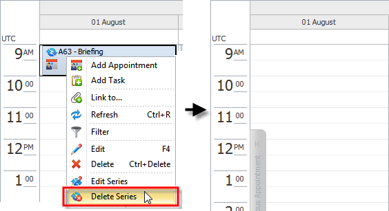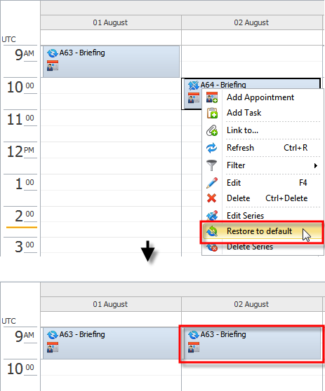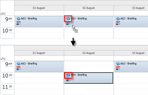 For example, recurring appointment "Briefing" starts at 9.00 AM each workday, except for the second of August, when the appointment should start at 10.00 AM. To make this exception to your series, you just drag it to 10.00 AM.