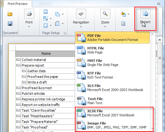 Note With Print Preview you can export data into two additional file formats: XLSX and Image (.png, .bmp, jpeg, .gif, .tiff, .emf, and .wmf).