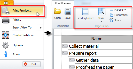 Before exporting data you can apply Print Preview settings, such as Orientation, Margins, to the export file.