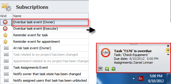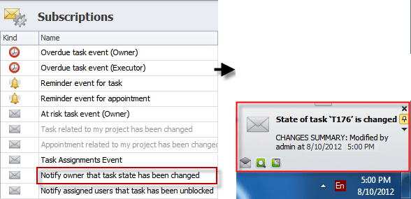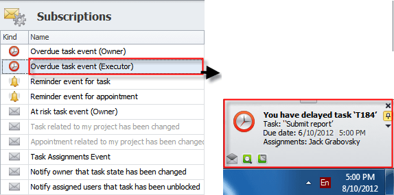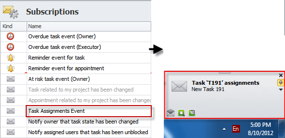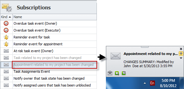 Note By default, both subscriptions "Task related to my project has been changed" and "Appointment related to my project has been changed" are inactive and grayed out. To activate them, open each subscription and check the Active option:
