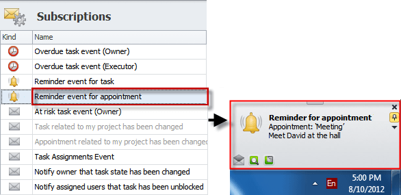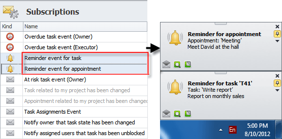 "Reminder" event includes two default subscriptions which remind users of tasks and appointments: