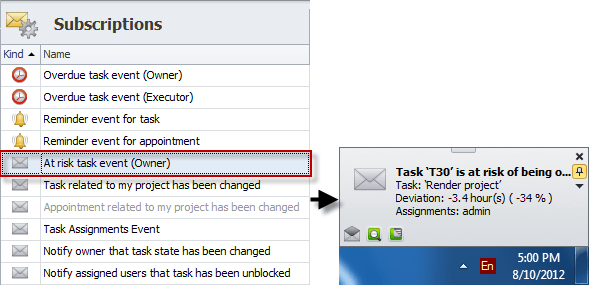 1) "At risk task even (Owner) subscription"notifies task owner that "Task is at risk of being behind schedule" if 'Deviation,%' is less than -10%: