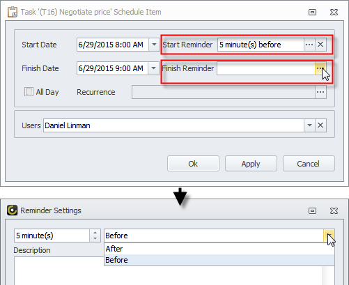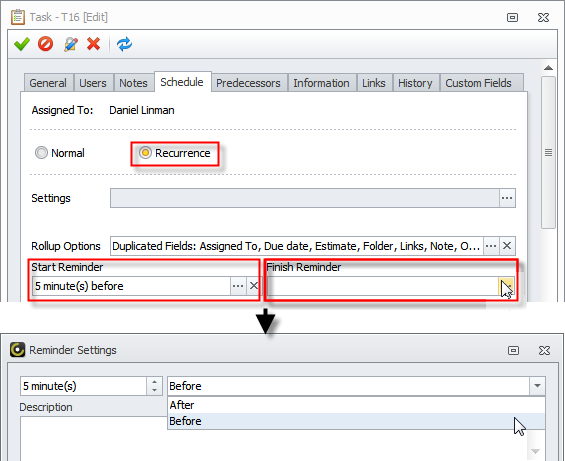 - In the Task dialog box, on the Schedule tab, click ellipsis in the Start Reminder box or the Finish Reminder box, and then in the Reminder Settings dialog box, enter time interval, click Before or After, and, if needed, enter required text in the Description box.