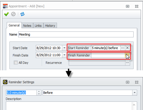 - In the Appointment dialog box, click ellipsis in the Start Reminder box or the Finish Reminder box, and then in the Reminder Settings dialog box, enter time interval, click Before or After, and, if needed, enter required text in the Description box.