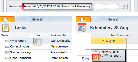 Note After you set reminder, the settings are displayed as a summary text in the Remind At box in the Task dialog box, and the task gets the bell symbol in the Info column of the Tasks view and the Task cell in the Schedule view.
