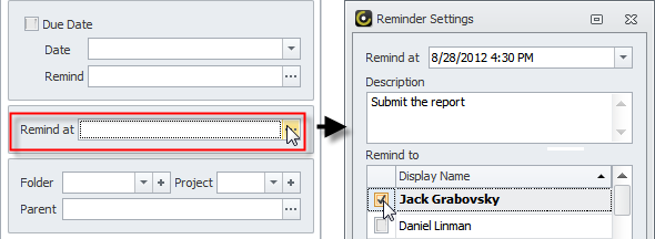 - In the Task dialog box, on the General tab, click ellipsis in the Remind box in the Due Date group, and then in the Reminder Settings dialog box, enter time interval, click Before or After, and select check boxes next to required users, and, if needed, enter required text in the Description box.