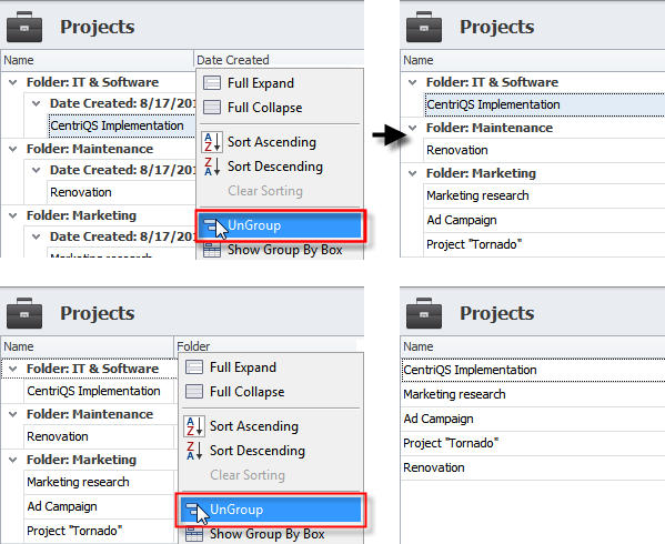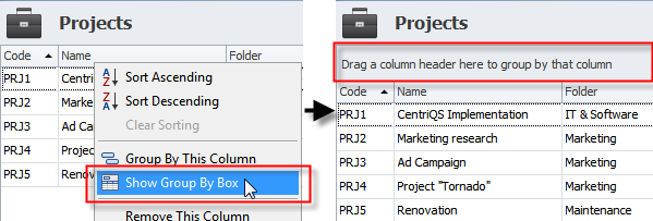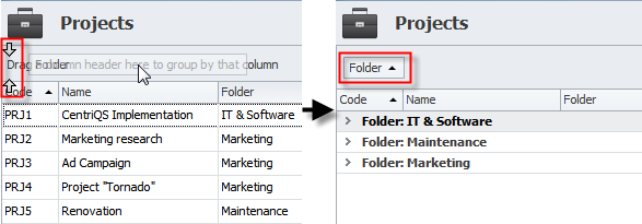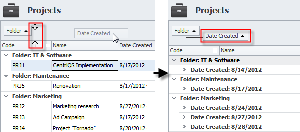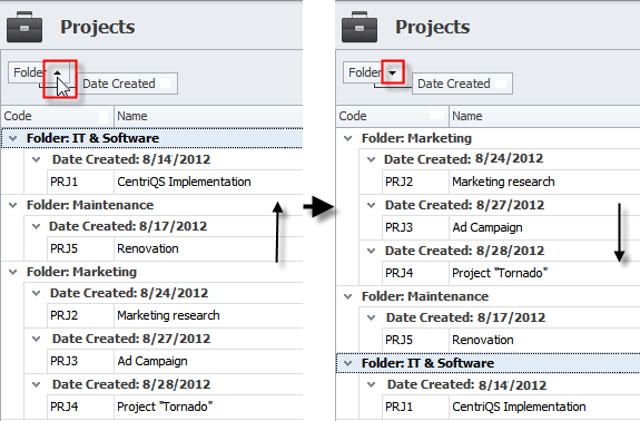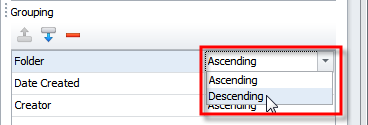 - Click required column in the Grouping list, and then click Ascending or Descending.