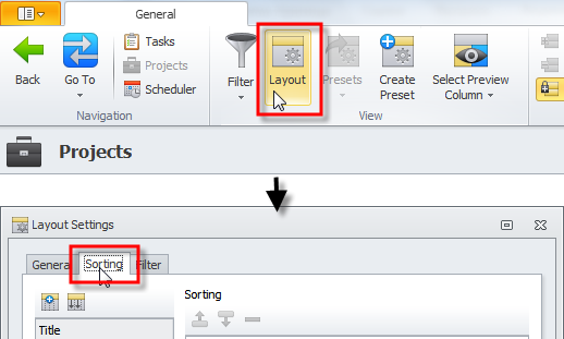 - On the ribbon, in the View group, click Layouts, and then in the Layout Settings dialog box, click the Sorting tab.