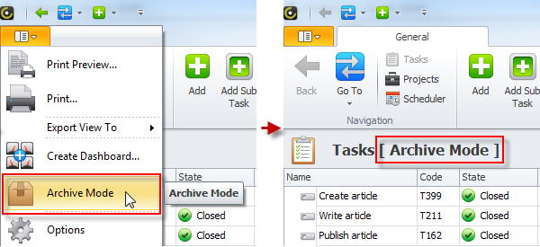 - Click Application Menu, and then click Archive Mode.