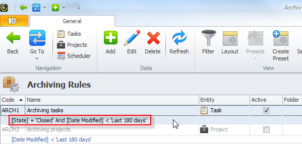 Tasks that have not been modified for the last 180 days are archived automatically according to the default Archiving tasks rule.