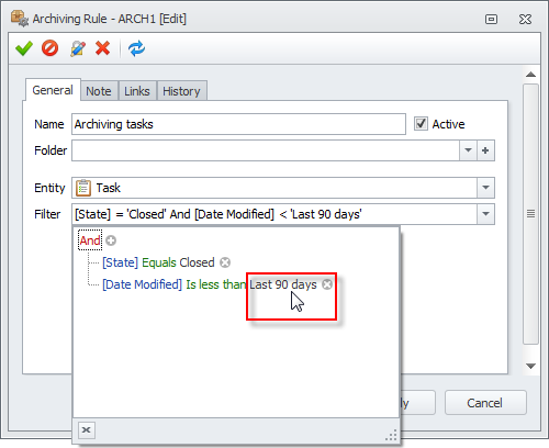 - Double-click the Archiving tasks rule, and then, in the Archiving Rule dialog box, on the General tab, make appropriate changes in the Filter box.