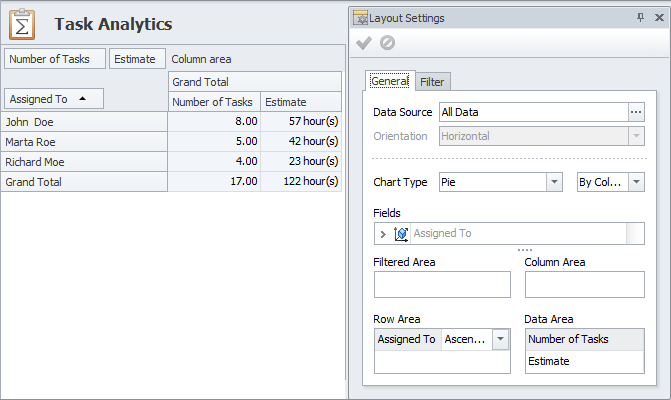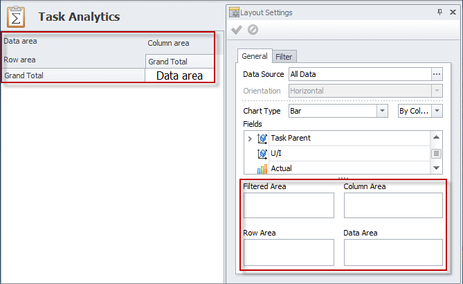 Task Analytics view consists of the Pivot table and the Layout Settings pane. The fields added from the Fields list to the areas in the Layout Settings pane are then displayed in the corresponding areas in the Pivot table.