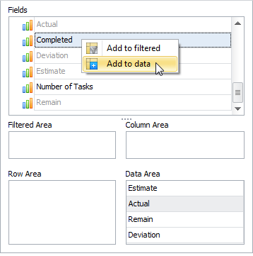 - Add the Estimate, Actual, Remain, and Deviation fields to the Data Area box.