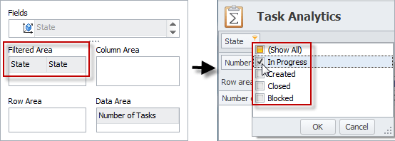 - Drag the State field from the Fields list to Filtered Area box, in the State filter header in the upper-left corner of the Task Analytics view, click the Quick Filter icon, and then select the check boxes next to the states you want to show.