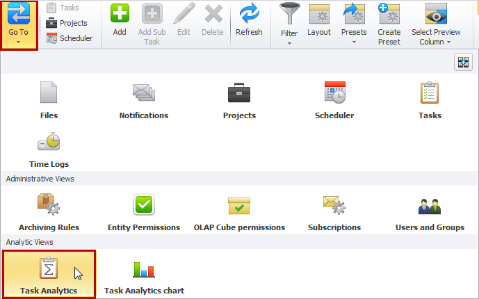 - To open the Task Analytics view, clickGo To, and then click Task Analytics.