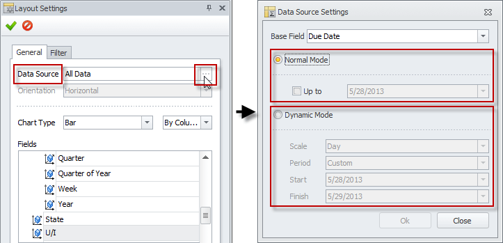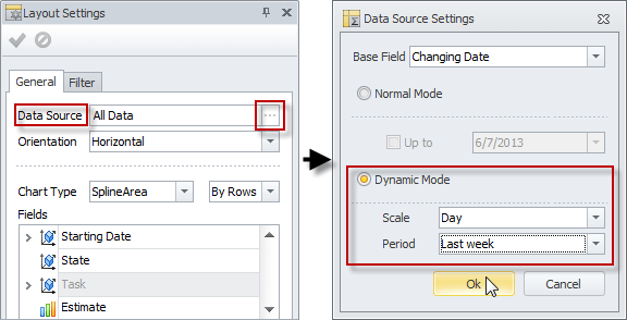 - In the Layout Settings pane, click ellipsis in the Data Source box, and then in the Data Source Settings dialog box, click Dynamic Mode, and set required Scale and Period.