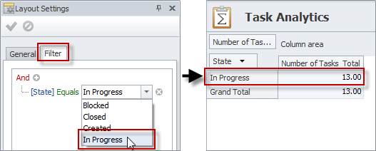 - In the Layout Settings pane, click the Filter tab and set required filter condition, ex.: [State] Equals [In Progress].