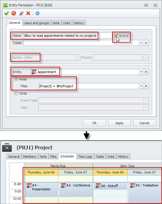 This permission rule allows users to view appointments related to a project, only if they are team members of this project.