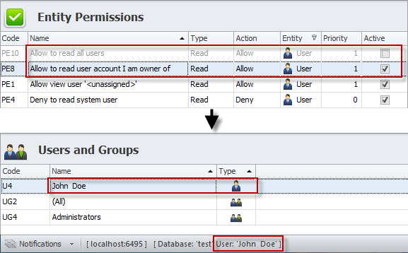 This permission rule allows users to view only their own user accounts created in the database; however, it doesn't work until you make the Allow to read all users permission rule inactive.