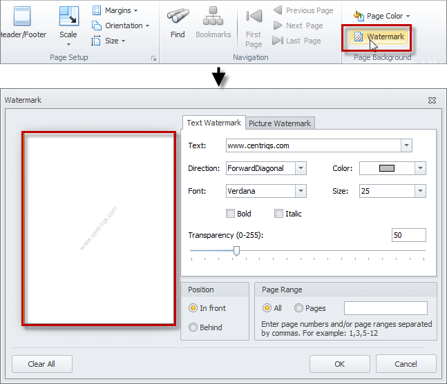 • To add a text or image watermark to the document, on the ribbon, in the Page Background group, click Watermark, and then enter required settings in the Watermark dialog box.