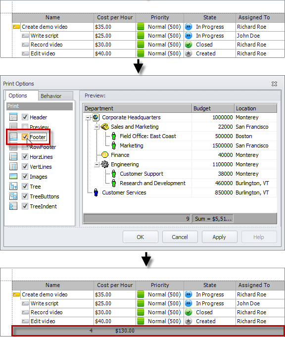 If you select the Footer check box, the columns footer will be shown at the bottom.