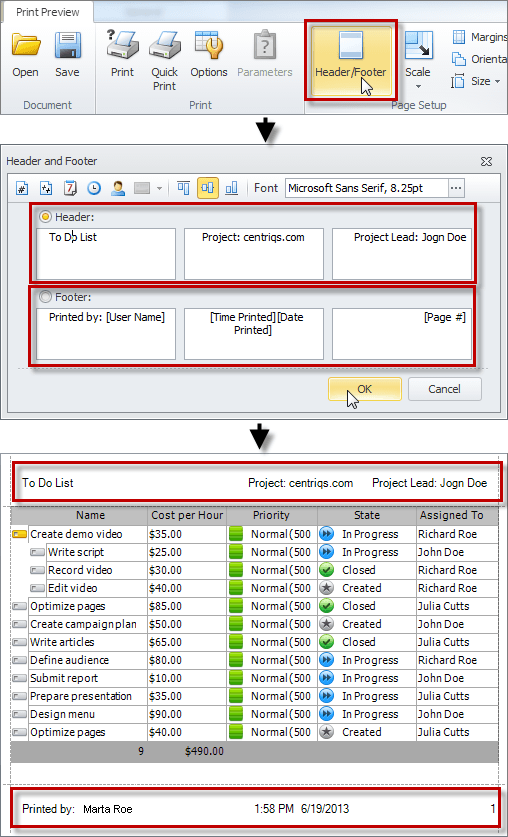 Note Both the header and the footer areas are divided into three sections that can show such information as Page Number, Date Printed, Time Printed, User Name, or custom text. In the Header and Footer dialog box, you can also select Alignment and Font.