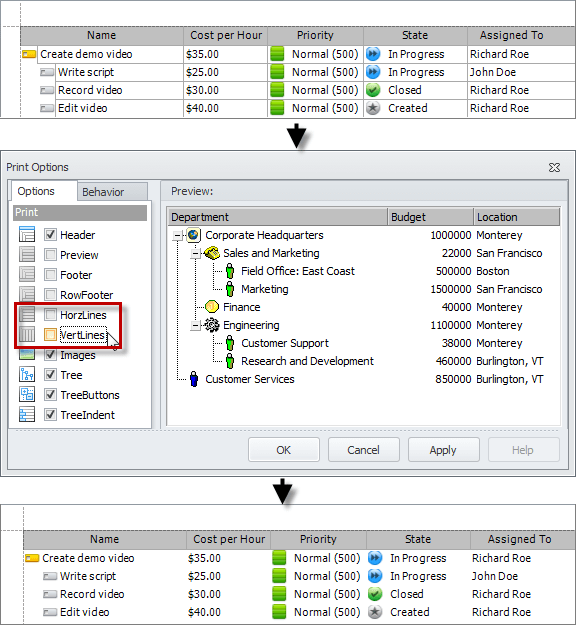 If you clear the HorzLines and VertLines check boxes, the document table will hide horizontal and vertical lines of columns and rows.
