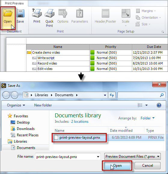 • To load layout settings that you saved, on the ribbon, in the Document group, click Open; in the Open dialog box, browse to the required *.prnx file, click it, and then click Open.