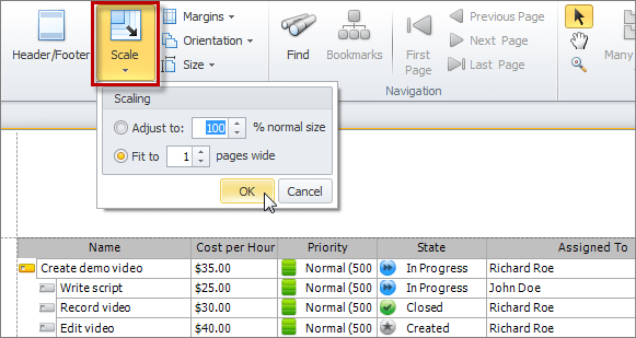 • To set the document scale, on the ribbon, in the Page Setup group, click Scale, and then click Adjust to N% normal size or Fit to N pages wide.