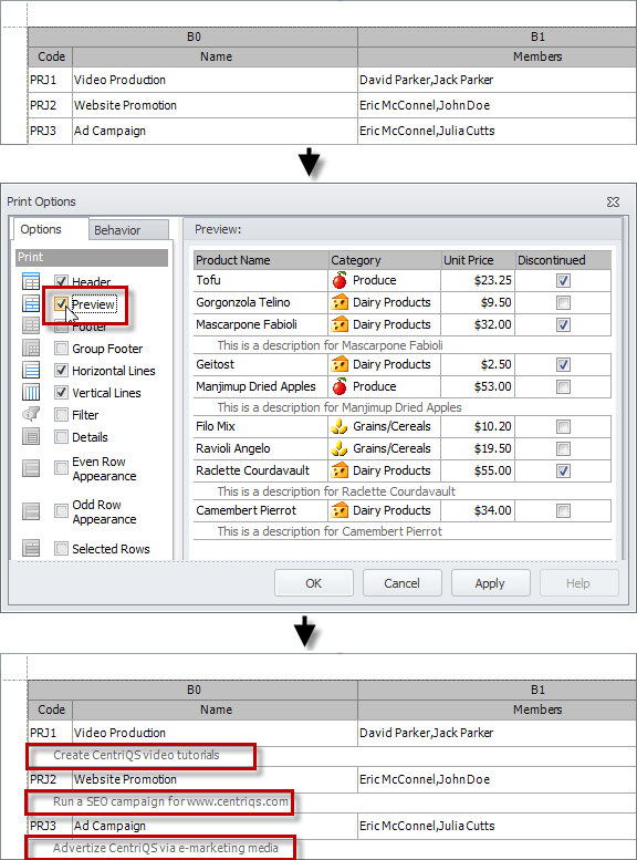 If you select the Preview check box, the notes will be shown under each record that has a note.