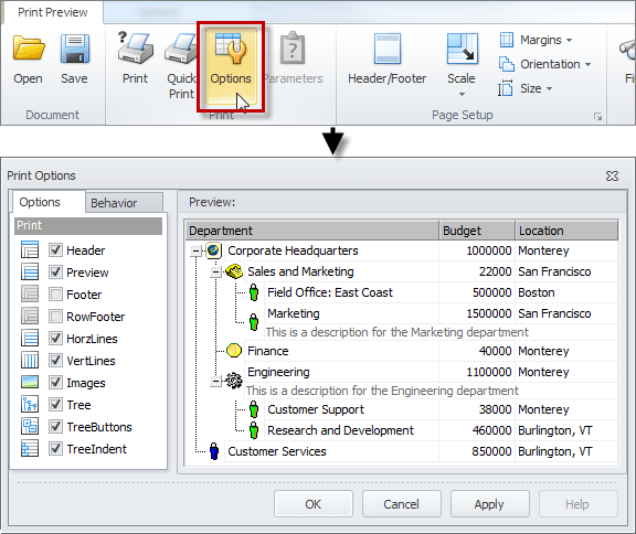 • To select print options and behavior, on the ribbon, in the Print group, click Options.