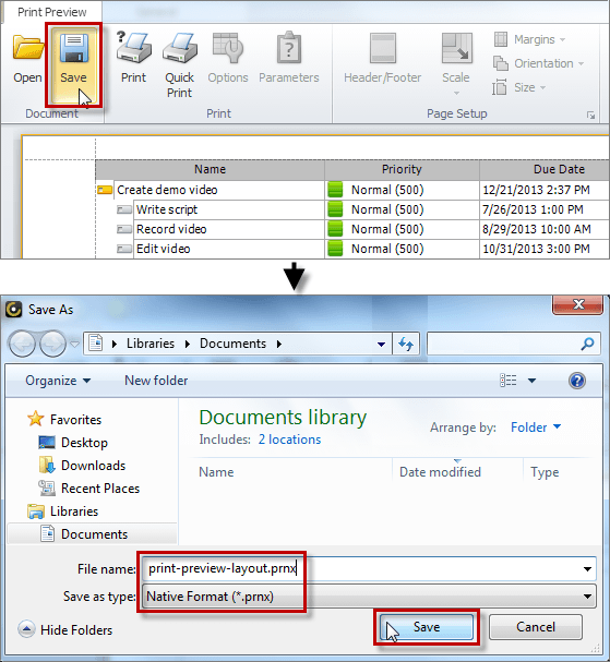 • To save layout settings of the document in the Native Format (*prnx), on the ribbon, in the Document group, click Save; in the Save As dialog box, type the name in the File name box, and then click Save.
