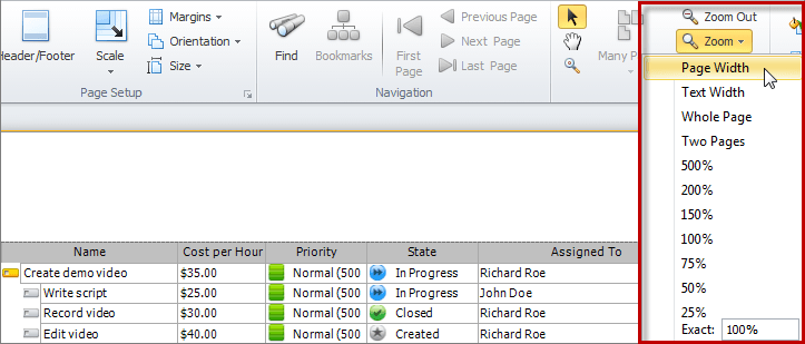 To change the document scale, on the ribbon, in the Zoom group, click Zoom In, Zoom Out, or Zoom.