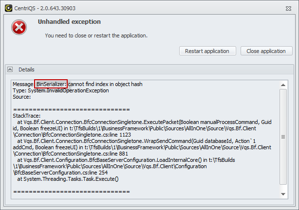 If the text of the error message contains the term “BinSerializer” in the message details, it may mean that the version of .Net on your computer is different than the version of .Net on your server computer.