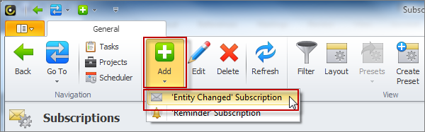 2. On the ribbon, in the Data group, click Add, and then click ‘Entity Changed’ Subscription.