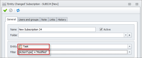 3. In the ‘Entity Changed’ Subscription dialog box, click required entity in the Entity list, and set the [Action Type] = 'Modified' condition in the Filter box.
