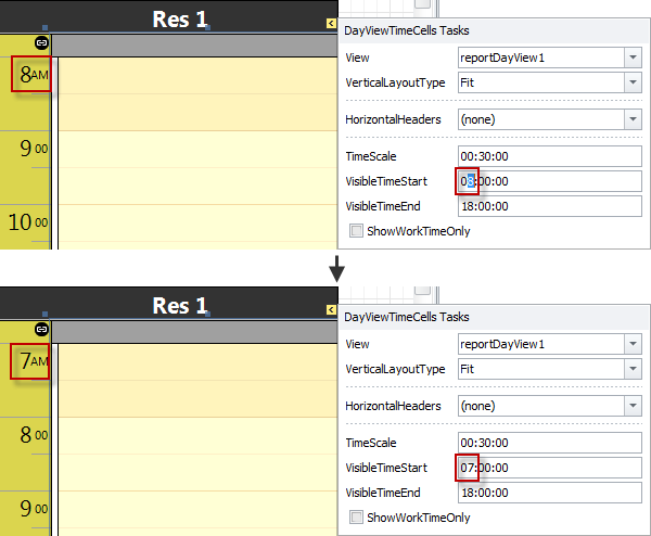 4. In the Report Designer view, click the DayViewTimeCells control, click the right-pointing arrow in the upper-right corner, and then change time values in the VisibleTimeStart and VisibleTimeEnd boxes.