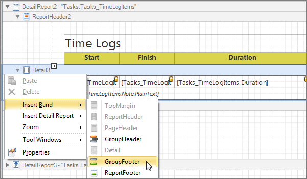 1. Right-click the required band, click Insert Band, and then click the required type of footer (GroupFooter, ReportFooter, or PageFooter).