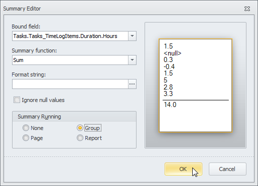 4. In the Summary Editor dialog box, in the Summary Running box, click required option (Page, Group, or Report), and then click OK.