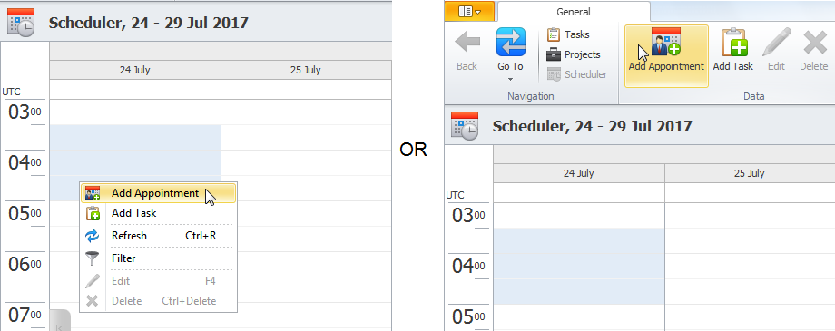 1. Right-click required date and time cell in the Scheduler view, and then click Add Appointment.