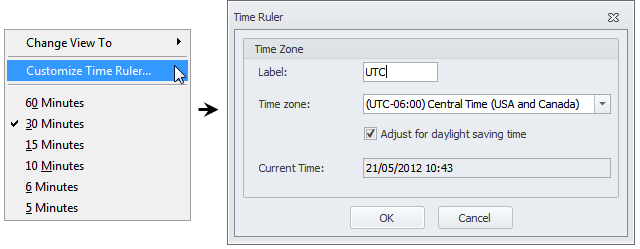 To change Time Zone settings, right-click the Time Ruler, click Customize Time Ruler, and then enter required settings in the Time Rule dialog box.