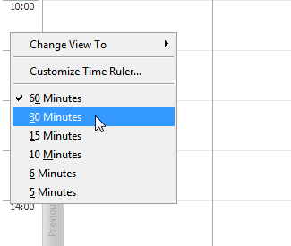 To change time interval of the Day calendar, right-click the Time Ruler, and then click the required time interval.