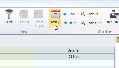 To show the current date in the Scheduler view, click Today on the ribbon.