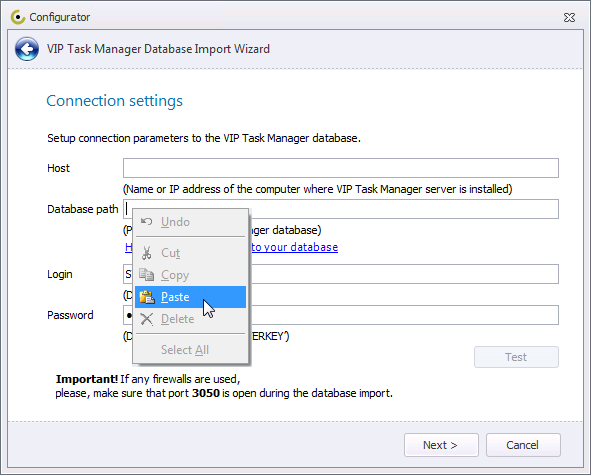 4. Paste the copied full path into the Database Path box of the VIP Task Manager Database Import Wizard.