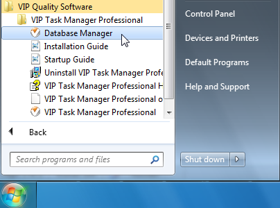 1. Click Start, click All Programs, click VIP Quality Software, click VIP Task Manager (Professional or Standard), and then click Database Manager.