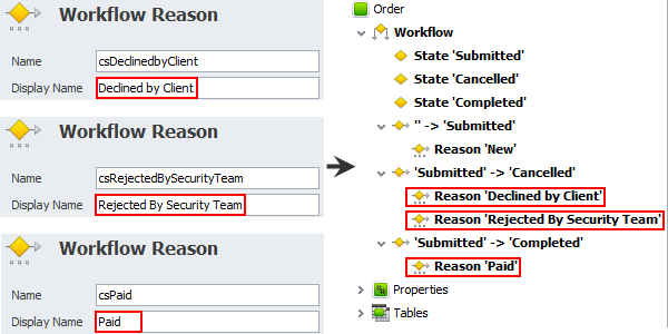 Note Transitions can have several reasons, for example, the Order entity can be changed to the Cancelled state because it is either Declined by Client or Rejected by Security Team. If there is more than one reason for one transition, the Default check box should be selected for only one of the reasons.